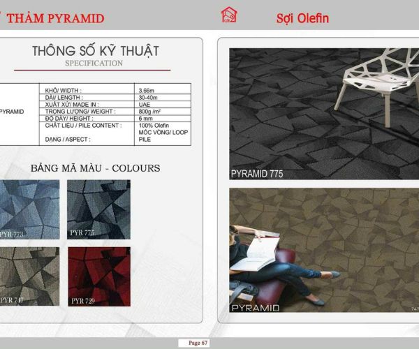Thảm cuộn Pyramid là dòng thảm trải sàn được thiết kế với họa tiết tam giác xen kẽ, tạo hiệu ứng 3D độc đáo, mang lại vẻ đẹp hiện đại và tinh tế cho không gian nội thất. Dưới đây là một số thông tin chi tiết về sản phẩm: